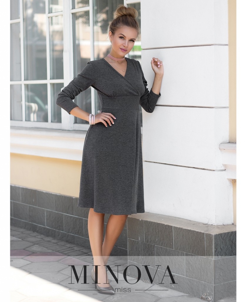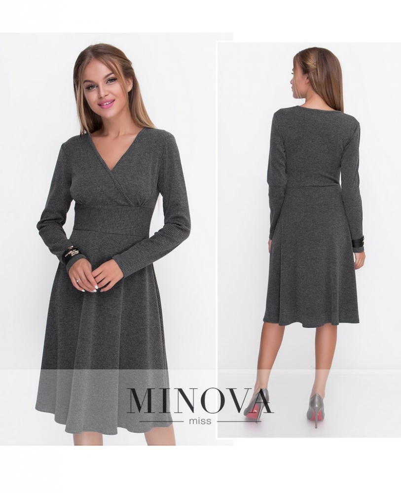 Приятное платье из тонкого трикотажа «в рубчик» с лифом «на запах» и отрезным подолом А-силуэта. Рукава полной дины. Платье без застежек и молний.