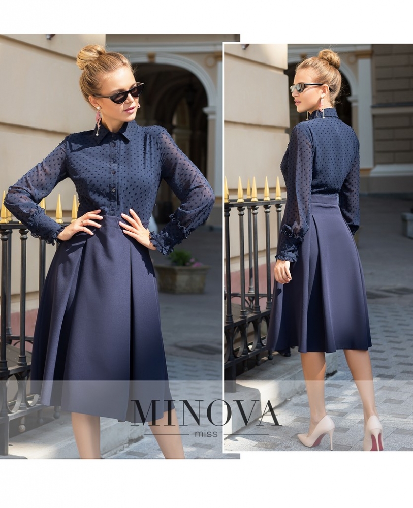 Женственное и легкое платье из комбинированного материала. Лиф платья изготовлен из шифоновой ткани с фактурным горошком и дополнительным подкладом. Лиф рубашечного типа застегивается на пуговицы. Длинные рукава с широкими акцентными манжетами застегиваются на две пуговицы. Отрезной подол оформлен клиньевыми вставками. Сбоку платье застегивается на скрытую молнию.