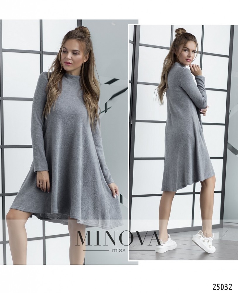 Уютное теплое расклешенное платье с высокой горловиной и длинными рукавами. Спинка немного удлинена. Платье изготовлено из очень приятного мягкого материала.