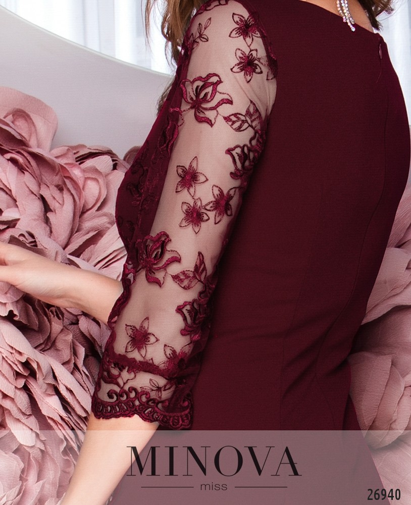 Силуэтное платье с акцентом на кокетке. Платье двухслойное, нижняя часть являет собой однотонное платье с отрезной кокеткой. Верхняя часть- изысканное кружево, которое располагается по кокетке. Рукава длиной до локтя так же изготовлены из кружева. По спинке идет потайная молния.