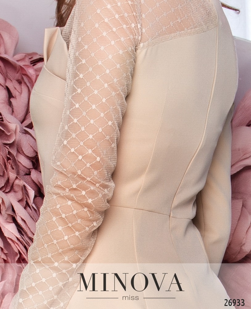 Оригинальное приталенное платье, декорированное оборкой по линии декольте. Особой элегантности и нарядности образу придает сеточка с узором, из которой выполнен один рукав и часть платья вокруг горловины.
