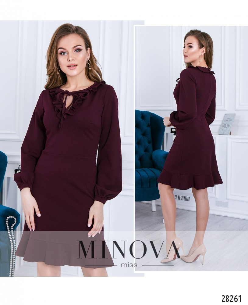 Романтичное платье с нежными рюшами. Ворот платья обрамлен оборкой в виде жабо и завязывается с помощью двух лент. Рукава-фонарики собраны в манжеты на пуговицах. Отрезной от талии подол оформлен воланами. На спине платье застегивается на скрытую молнию.
