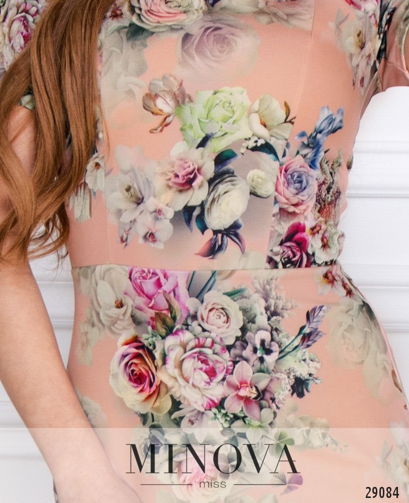 Платье – футляр с короткими рукавами в нежный цветочный рисунок. Платье прекрасно подчеркивает женственность силуэта засчет отрезной талии и вытачек. На спинке платье застегивается на скрытую молнию и дополнено разрезом по линии шага.