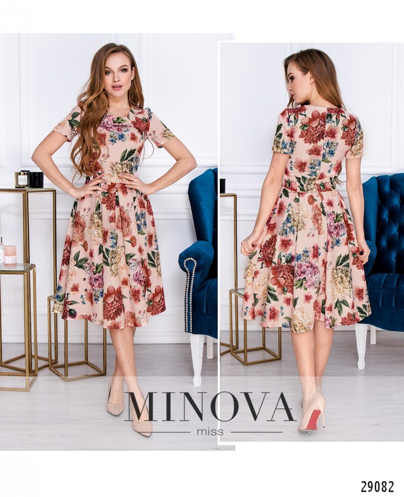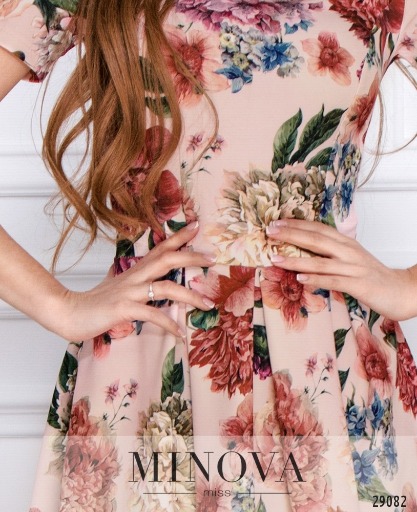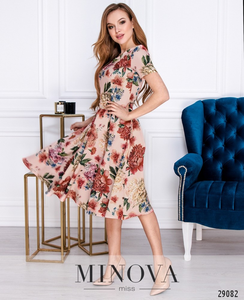 Романтичное платье в цветочный принт с юбкой в складку. Отрезной лиф с короткими рукавами скроен с вытачками на груди. Отрезной расклешенный подол собран в легкие складки, которые придают объем подолу. На спине платье застегивается на молнию.
