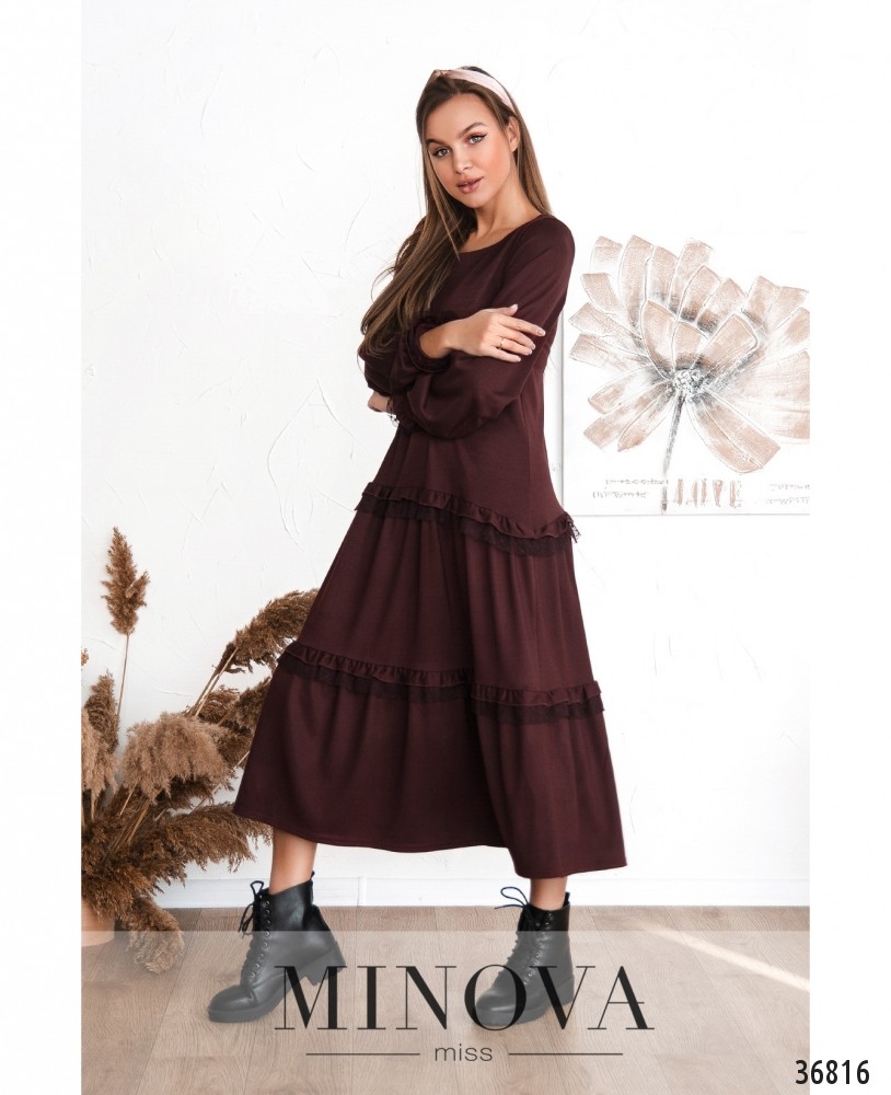 Очень нежное и женственное платье из новой коллекции Minova имеет все шансы стать вашим фаворитом – ведь оно практически универсально: и на прогулку, и на свидание, и для дома. Платье А-силуэта, с оборками на подоле. Рукава полной длины, с небольшими волнистыми манжетами. Манжеты и оборки подола украшены лёгкой прозрачной сеточкой, сеточка декорирована ромбиками из бархатистой ткани. Платье без застёжек и карманов, с полукруглым широким вырезом горловины. Вы можете сочетать такой наряд с любой подходящей обувью, а благодаря свободному крою оно будет прекрасно смотреться на любом типе фигуры.