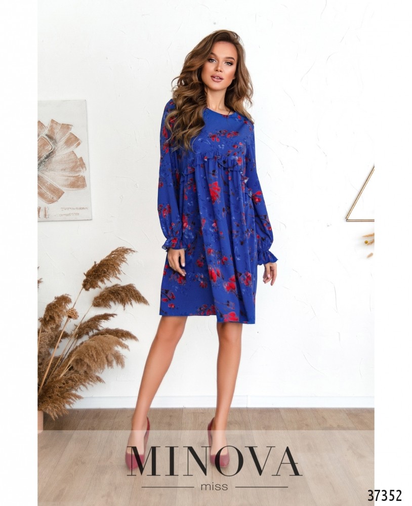 Лёгкое платье А-силуэта с подшитым к верху и расклешённым подолом. Под грудью – асимметричные оборки. Застёжек и карманов нет. Вырез горловины полукруглый, неглубокий. На манжетах рукавов вшиты резинки, манжеты с оборками.