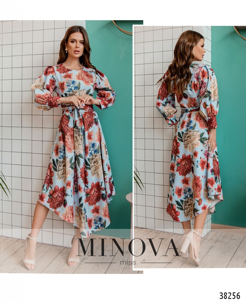 Привлекательное стильное платье с асимметричным подолом, присобранным на талии с помощью декоративных складок, по бокам подол скруглён, подшит к верху. Вырез горловины полукруглый, рукава с мягкими манжетами без пуговиц, на груди вытачки. В комплекте – пояс в тон. Застёжка – потайная молния, вшитая слева.