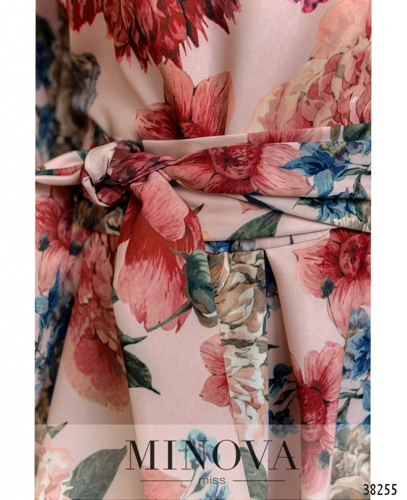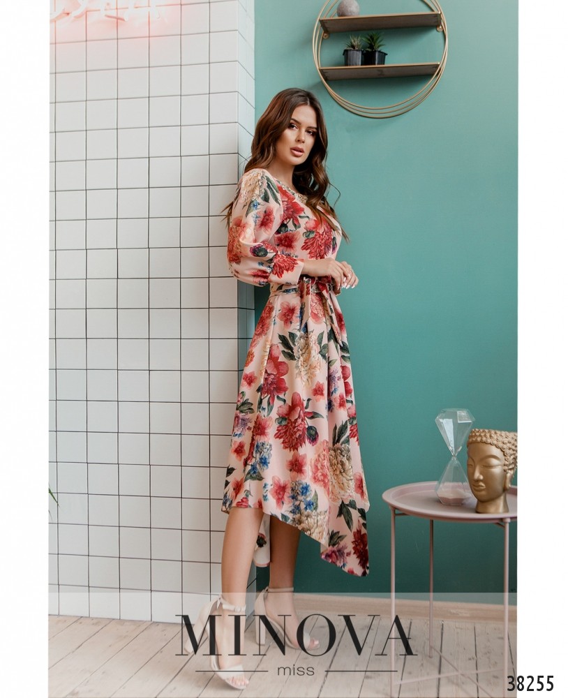 Привлекательное стильное платье с асимметричным подолом, присобранным на талии с помощью декоративных складок, по бокам подол скруглён, подшит к верху. Вырез горловины полукруглый, рукава с мягкими манжетами без пуговиц, на груди вытачки. В комплекте – пояс в тон. Застёжка – потайная молния, вшитая слева.