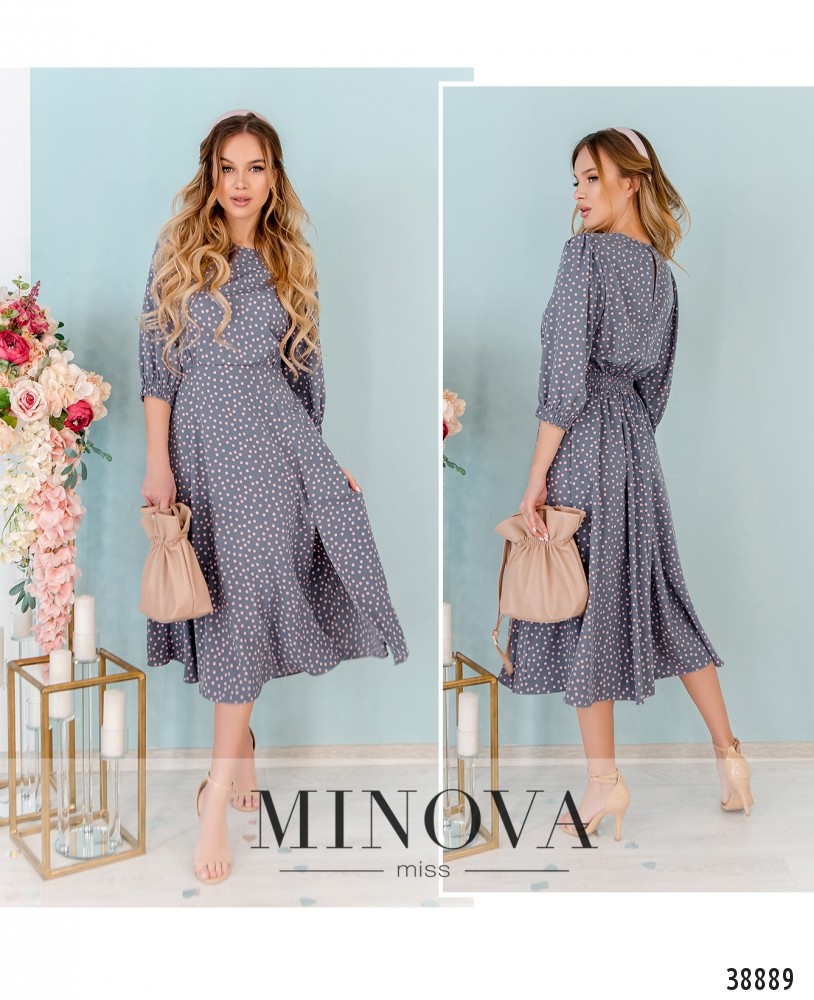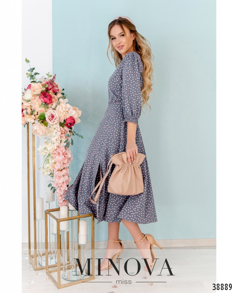 Нежное и женственное платье с горошек, подол расклешённый, в пояс и в манжеты рукавов вшита резинка, рукава фасона "фонарик". Карманов нет, застёгивается на пуговицу сзади под шеей.