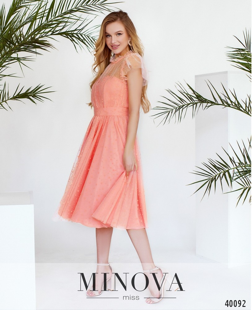 Нарядное платье с полупрозрачным верхним слоем и мягким нижним слоем. Рукава-лепестки из прозрачной ткани. Подол подшит к верху и расклешён. В комплекте - пояс, который застёгивается на две пуговки. Платье застёгивается на молнию, вшитую по спинке. В лиф вшиты две крепкие дуги, как в корсет, что помогает удерживать изящную форму. Карманов нет. Талия платья на резинке, поэтому параметры обхвата талии указаны в свободном и растянутом виде.