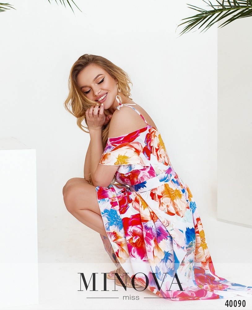 Яркое летнее платье с интересными рукавами: платье держится на тонких шлейках, а рукава слегка прикрывают плечи. Подол двухслойный, с мягким нижним слоем. Вырез горловины V-образный с двух сторон. Застёжка - вшитая по спинке молния. Подол отделён от лифа лентой и расклешён. Карманов нет. Ткань нежная, очень приятная к телу. Шифон со средней растяжимостью, батист (натуральная подкладка) почти не тянется