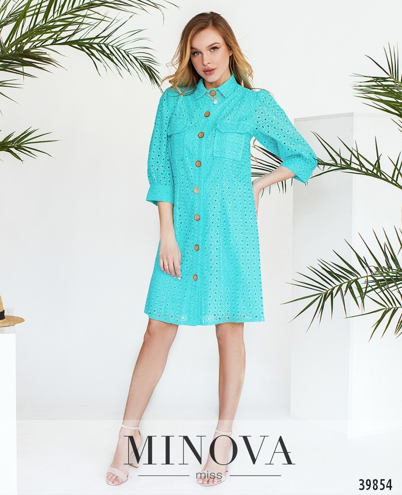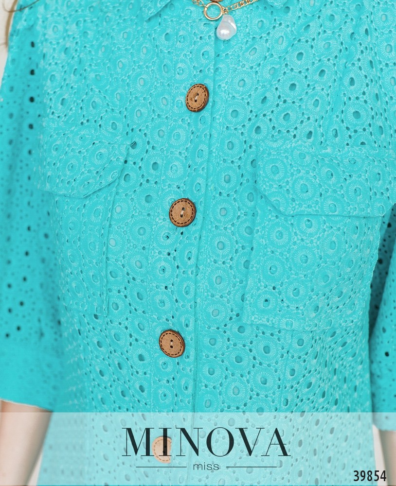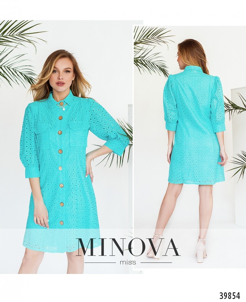 Стильное платье с накладными карманами на груди. Застёгивается на ряд пуговиц спереди на планке, воротничок отложной, рукава с манжетами, без пуговиц. Платье с ажурным верхним слоем и с мягким нижним, подшитым к верхнему.