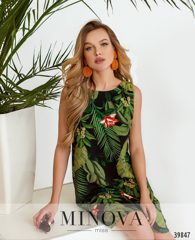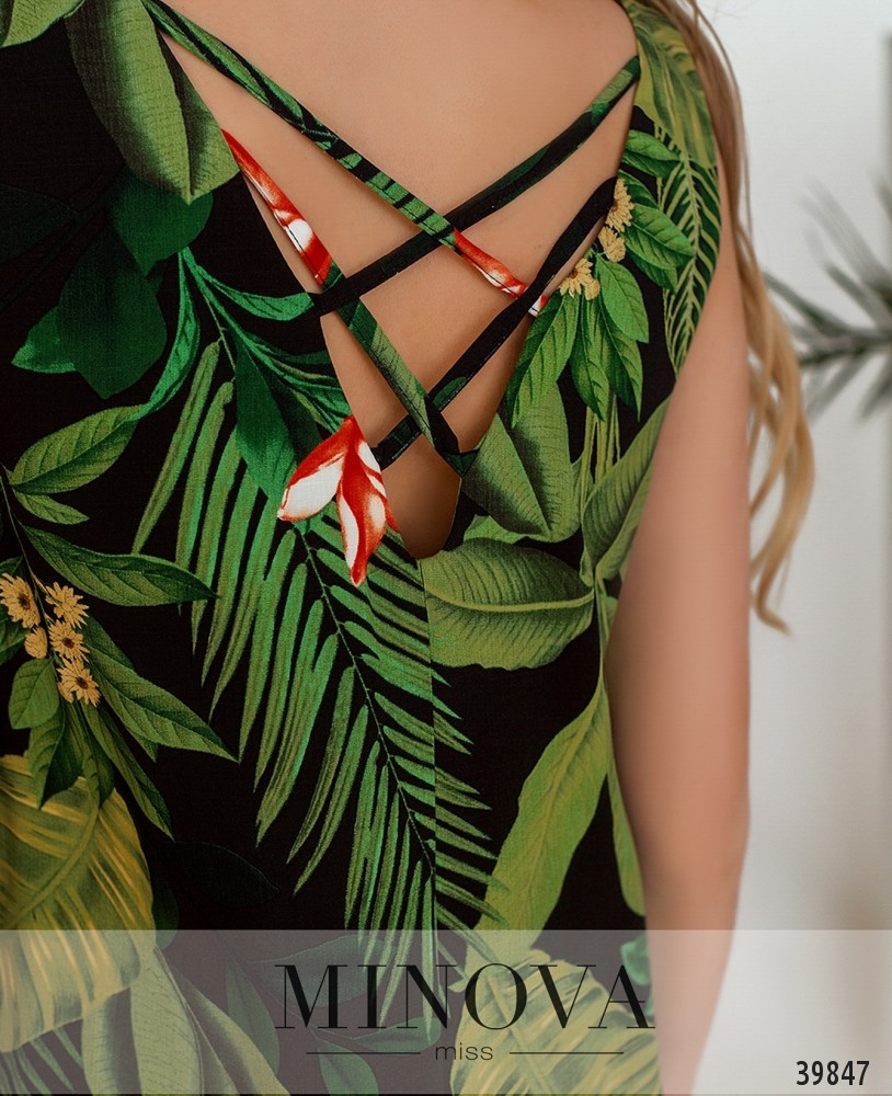 Стильное платье с ярким тропическим принтом, без застёжек и карманов, на груди вытачки. На спинке вырез украшен перекрещенными лентами.
