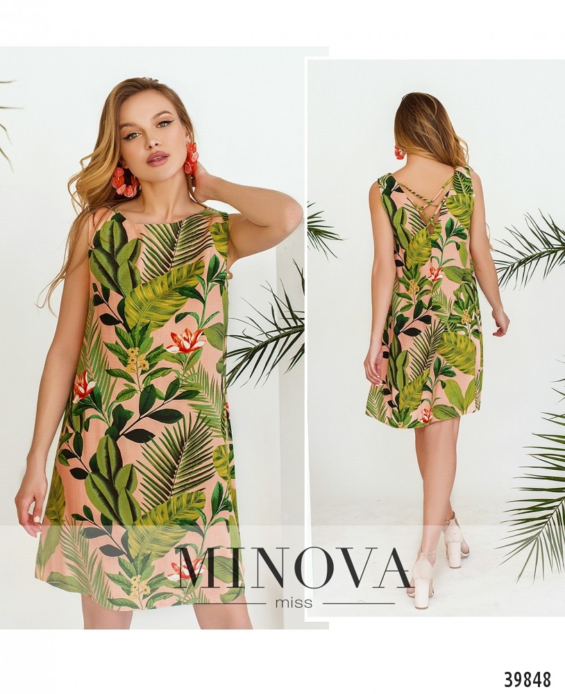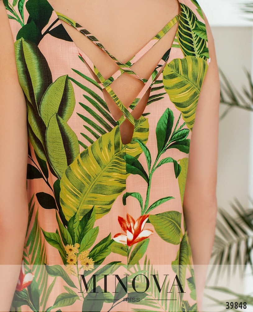 Стильное платье с ярким тропическим принтом, без застёжек и карманов, на груди вытачки. На спинке вырез украшен перекрещенными лентами.
