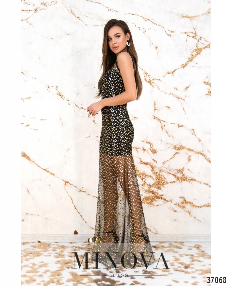 Платье макси с подкладкой мини. Приталенный силуэт, мягкая подкладка. Сверху полупрозрачная сеточка с золотистыми звёздами. Подол немного расклешён. Вырез горловины полукруглый, рукавов и карманов нет. Застёгивается на потайную молнию по спине. Горловина и вырезы рукавов уплотнены тканью.