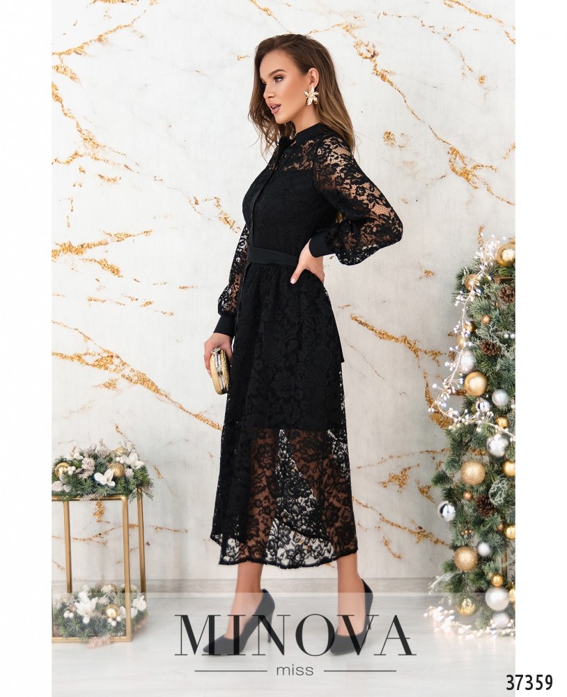 Нарядное праздничное платье приталенного силуэта с расклешённым подолом. Снизу более короткая мягкая подкладка, сверху – кружево. Рукава и плечи без подкладки, на рукавах мягкие манжеты с двумя пуговицами. Воротник – небольшая стоечка, спереди по центру до низа подола – планка с пуговицами. Карманов нет. В комплекте пояс. На груди вытачки. Пояс/аксессуар входит в комплект.