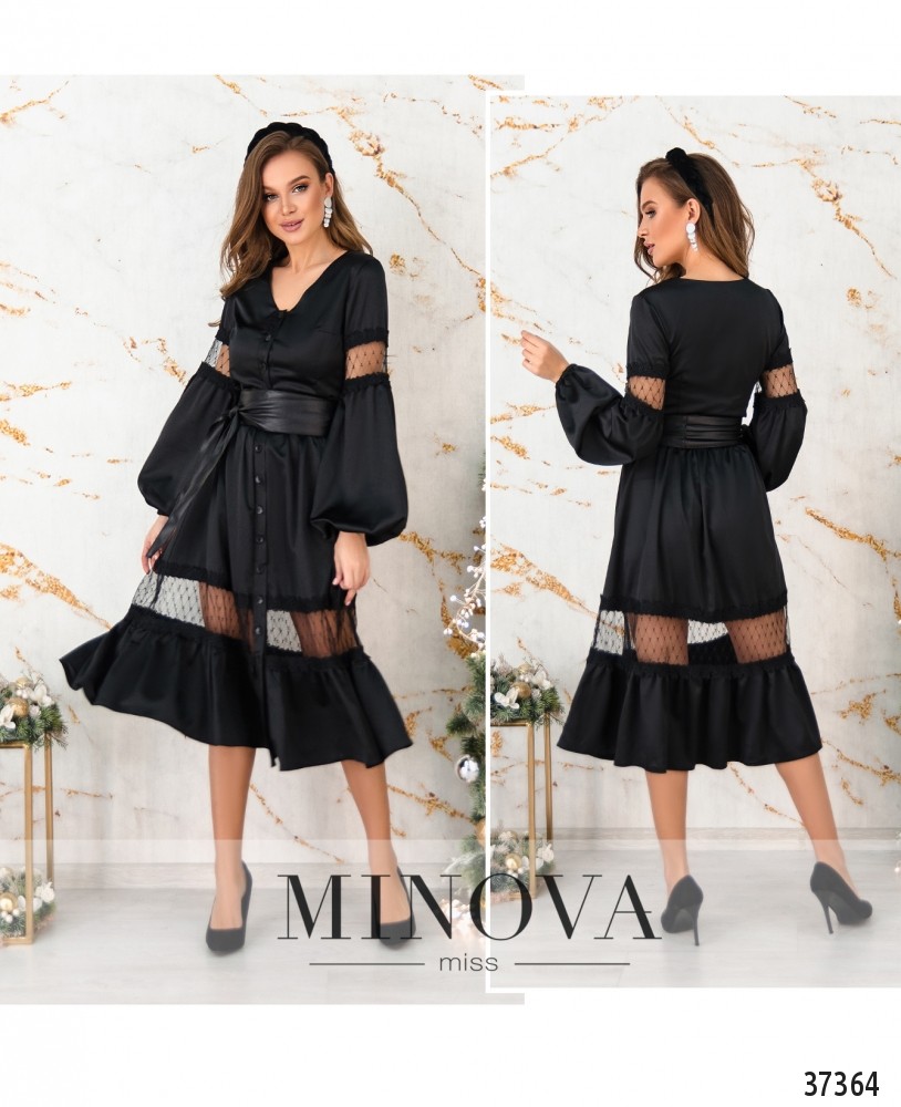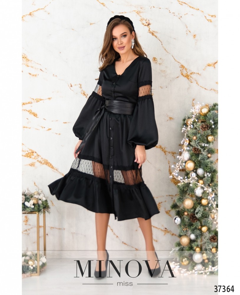 Женственное шёлковое платье с кружевом на подоле и на плечах. Силуэт приталенный, в пояс вшита резинка, подол расклешён. На груди – поперечные вытачки. Рукава со вшитой на запястьях резинкой. В комплекте широкий пояс. Вырез горловины V-образный. Застёгивается на пуговицы, расположенные спереди на планке, от горловины до подола. Пояс/аксессуар входит в комплект.