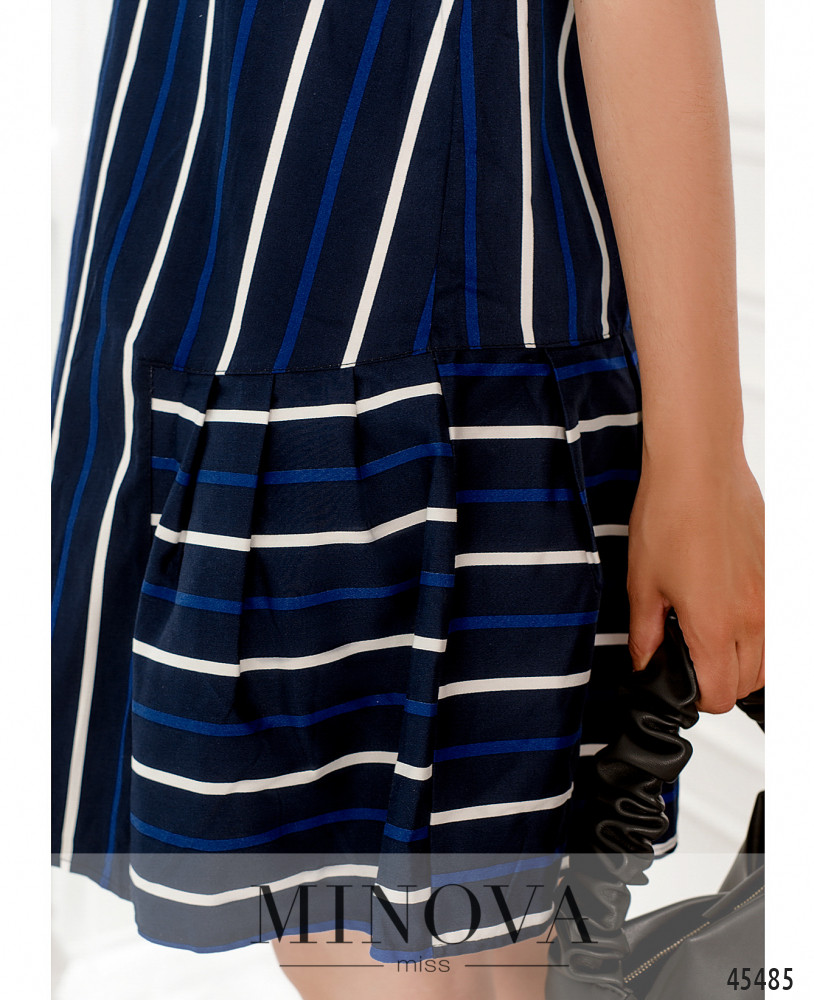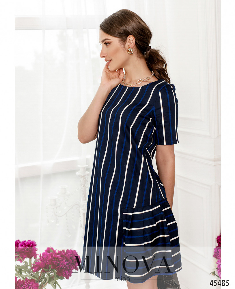 Минималистичное платье в полоску с короткими рукавами и полукруглым вырезом горловины поможет создать лаконичный летний образ на каждый день. Строгий прямой крой идеально дополнен воздушной оборкой, пришитой к подолу сзади и по бокам. Дополните образ обувью в спортивном или классическом стиле, а также сумочкой или рюкзаком.