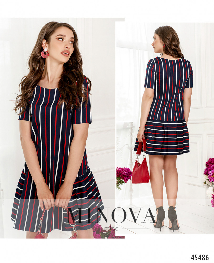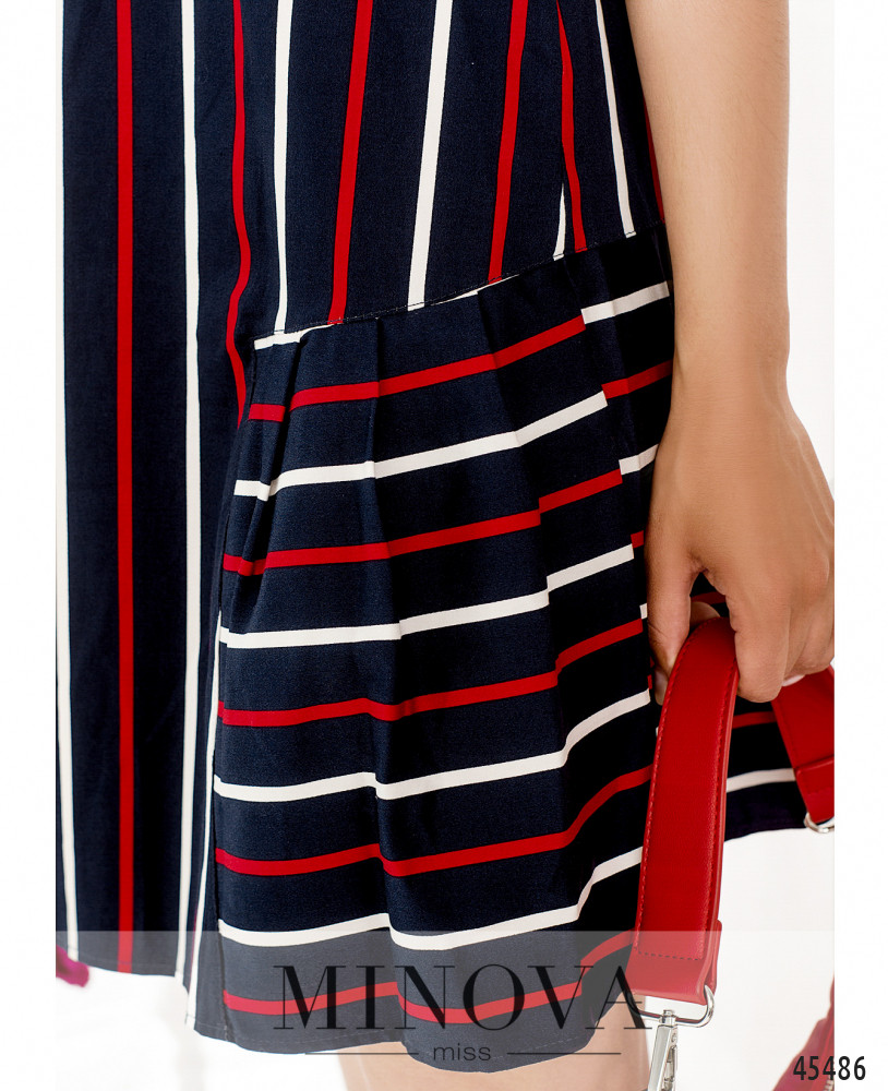 Минималистичное платье в полоску с короткими рукавами и полукруглым вырезом горловины поможет создать лаконичный летний образ на каждый день. Строгий прямой крой идеально дополнен воздушной оборкой, пришитой к подолу сзади и по бокам. Дополните образ обувью в спортивном или классическом стиле, а также сумочкой или рюкзаком.
