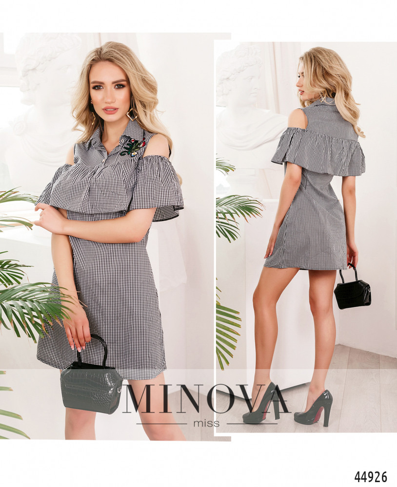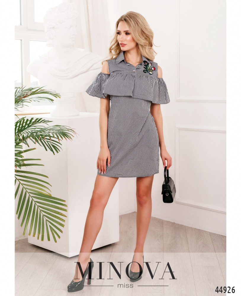 Стильное платье с отложным воротничком и двумя пуговками, на лифе - оборки, на плече вышивка. Рукава-оборки, со вшитыми резинками, плечо открыто. Карманов нет.