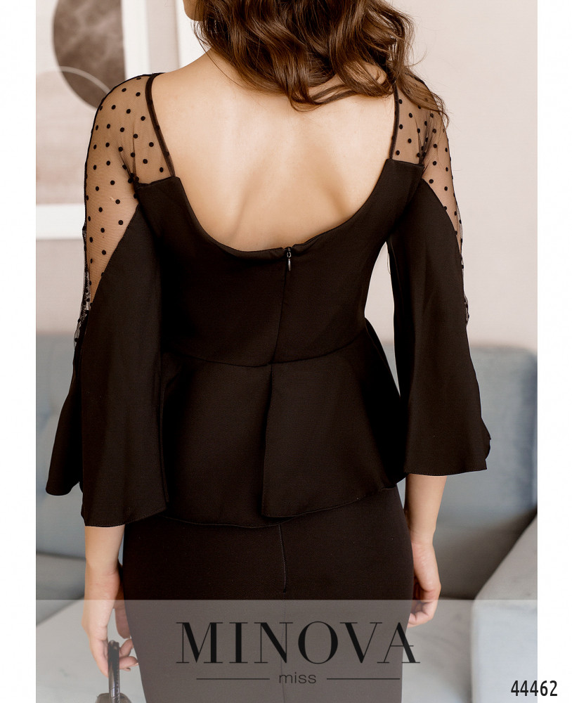 Нежное и очаровательное платье приталенного силуэта с баской на талии. Подол фасона "карандаш". Рукава расклешённые, с разрезом по шву. На груди вытачки. Верх лифа и плеч спереди украшен полупрозрачной сеточкой, вырез горловины спереди неглубокий, V-образный, по спинке более глубокий, полукруглый. На баске сзади разрез по центру. Застёжка - молния, вшитая по спинке. Карманов нет.