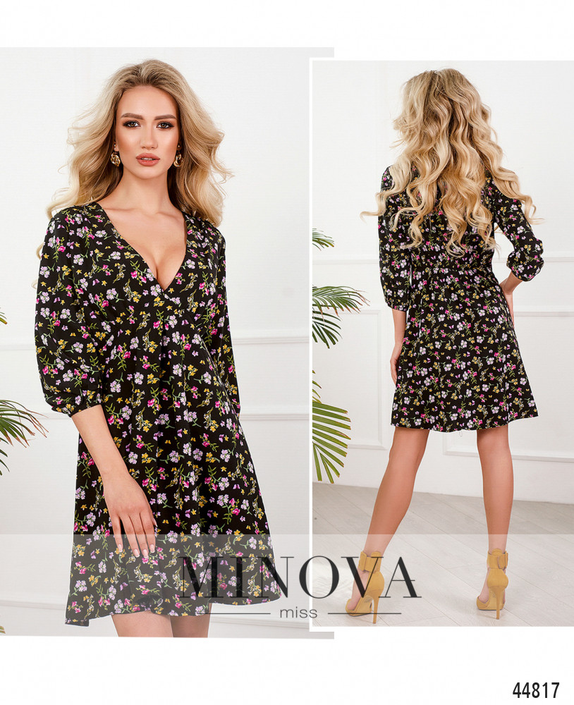 Элегантное платье с глубоким V-образным вырезом декольте, подол отрезной, на груди ткань присобрана. Ткань подола также расходится от груди. Рукава со вшитыми на запястьях резинками. Застёжек и карманов нет.