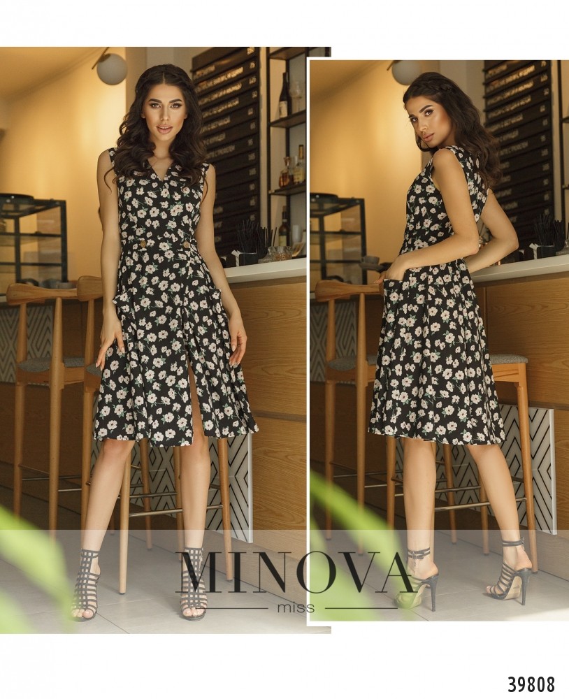 Яркое платье на запАх с цветочным принтом, застёгивается на две пуговицы на талии, подол расклешён, по бокам на бёдрах - накладные карманы.