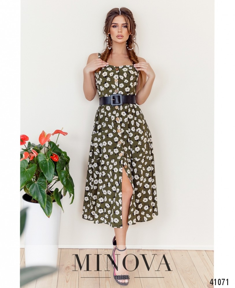 Привлекательное и романтичное платье с накладными карманами по бокам, застёгивается на ряд пуговиц спереди на планке, бретели широкие, мягкие. По бокам присобрано на талии.