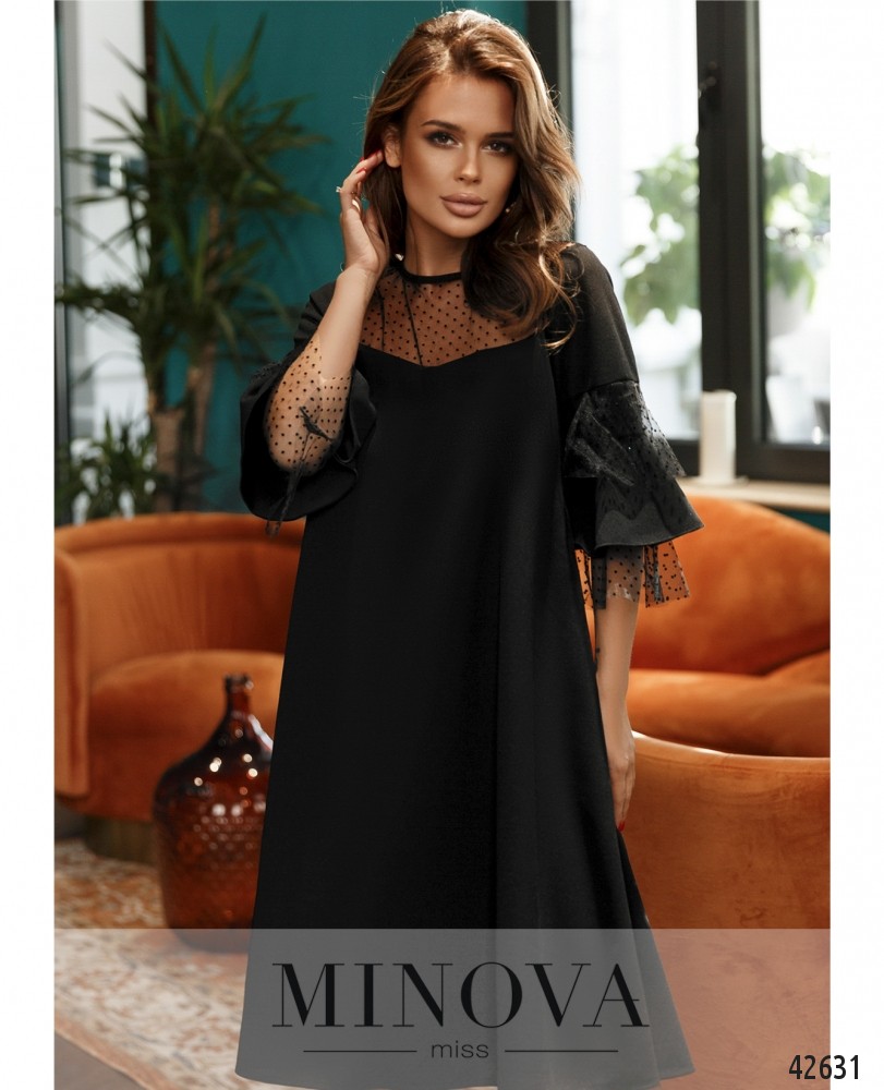 Элегантное платье А-силуэта с полупрозрачным верхом на груди и спинке, рукава двуслойные, расклешённые, слои чередуются из плотной ткани и полупрозрачной сеточки. Карманов нет, застёжка - пуговка сзади под шеей.