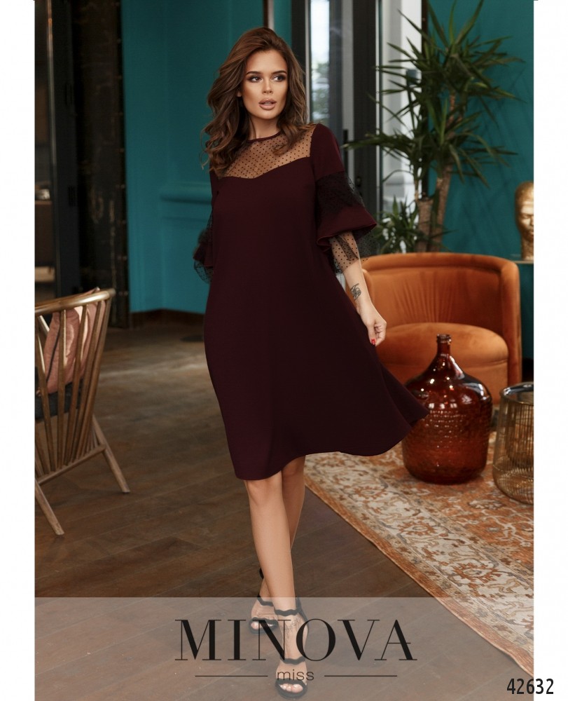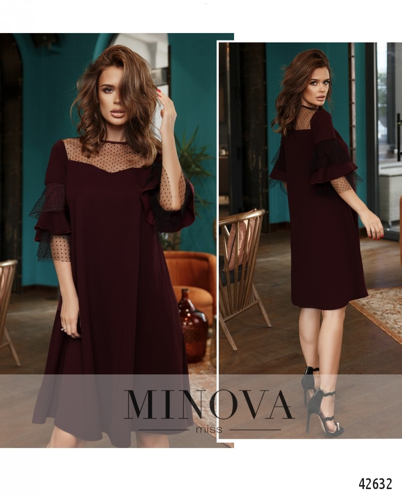 Элегантное платье А-силуэта с полупрозрачным верхом на груди и спинке, рукава двуслойные, расклешённые, слои чередуются из плотной ткани и полупрозрачной сеточки. Карманов нет, застёжка - пуговка сзади под шеей.