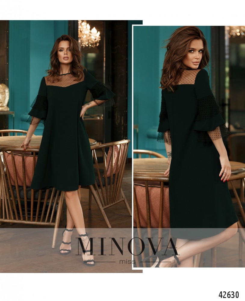 Элегантное платье А-силуэта с полупрозрачным верхом на груди и спинке, рукава двуслойные, расклешённые, слои чередуются из плотной ткани и полупрозрачной сеточки. Карманов нет, застёжка - пуговка сзади под шеей.