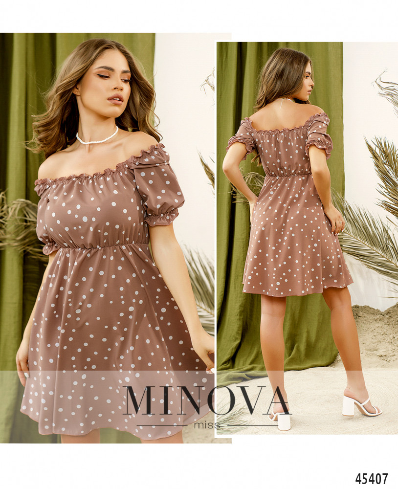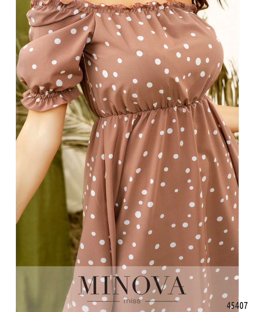 Создай нежный образ в романтическом стиле, надев это платье с открытыми плечами и рукавами-фонариками. Расклешенный летящий подол и резинки, вшитые по линии плеч и под грудью, делают эту модель воздушной и изящной. Невесомая ткань с актуальным принтом в горох, из которой выполнено платье, даст возможность чувствовать легкость и свежесть даже в самую жаркую погоду