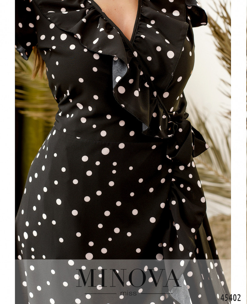 Легкое летнее платье на запАх с рукавами-крылышками и оборками вокруг декольте и по краю юбки помогает создать воздушный романтичный образ. Данная модель с V-образным вырезом незаметно крепится на завязках изнутри и снаружи, обеспечивая ваш комфорт и уверенность в каждом движении.