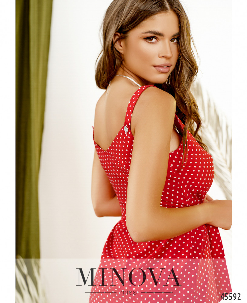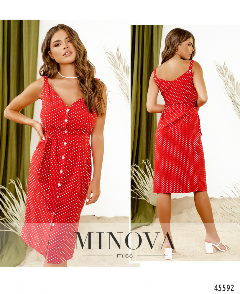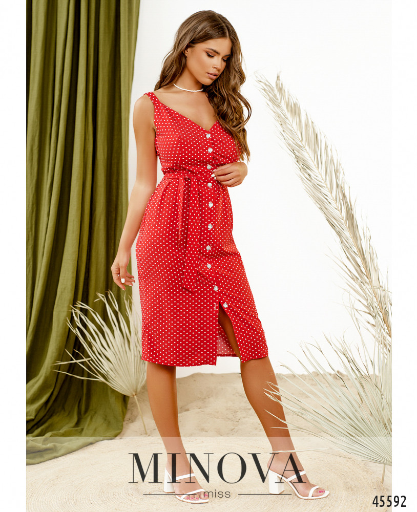 Женственное отрезное платье-сарафан миди на широких бретелях выполнено из ткани с актуальным принтом в горошек. Приталенный силуэт этой модели дополнен женственным V-образным вырезом и рядом функциональных пуговиц на планке спереди по центру, а вытачки спереди и на спинке обеспечат идеальную посадку по фигуре. Пояс входит в комплект.