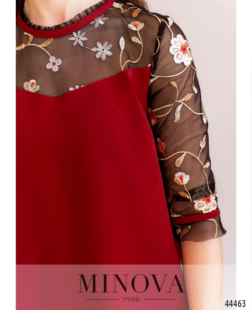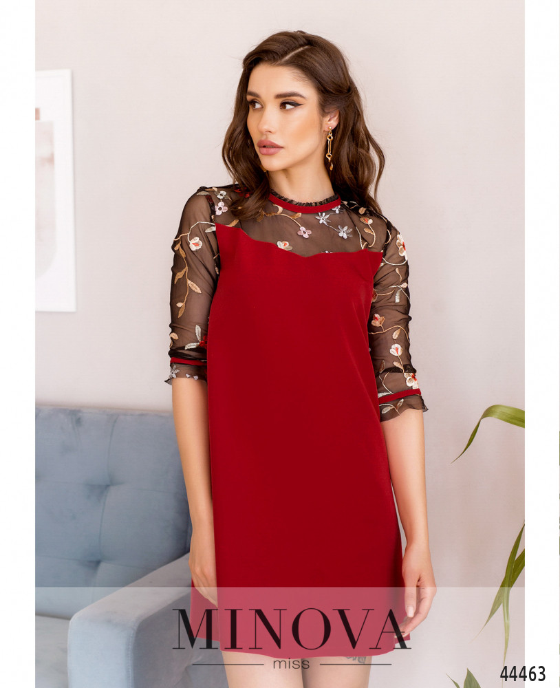 Привлекательное и яркое платье, верх лифа спереди и по спинке, а также рукава - из полупрозрачной сеточки с вышивкой. Рукава со вшитыми в манжеты контрастными резинками. Карманов нет, застёжка - пуговка сзади под шеей.