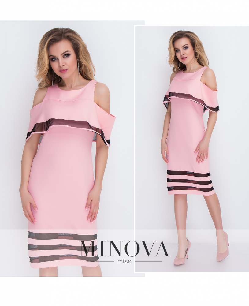 Оригинальное платье полуприлегающего силуэта с вырезами на плечах. Лиф дополнен широкими воланами и сеткой. Подол украшен полосками из сетки. На спинке платье застегивается на скрытую молнию.