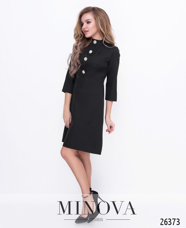 Лаконичное платье, которое подойдет для офисного, кэжуального гардероба. Платье с небольшой горловиной, рукавами до локтя. Лиф декорирован съёмными брошками. По талии вшивной пояс, который подчеркнет линию талии. От талии платье идет свободного кроя. По спинке скрытая молния.