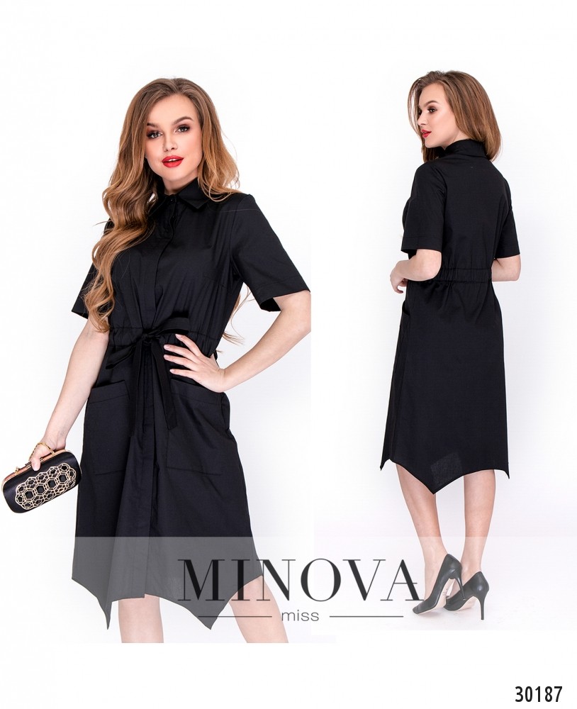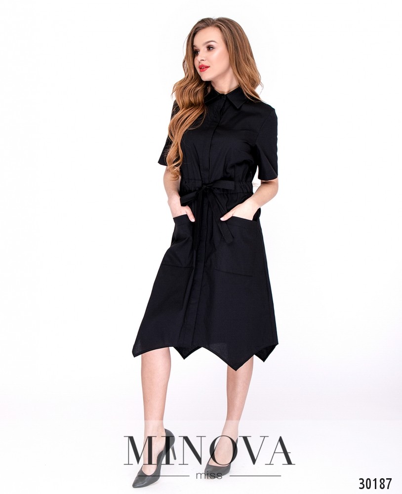 Платье-рубашка в стиле «сафари» с асимметричным подолом. Платье полностью застегивается на пуговицы на лицевой стороне. Талия регулируется вшитым поясом-кулиской и завязывается на лицевой стороне. Подол дополнен накладными карманами.