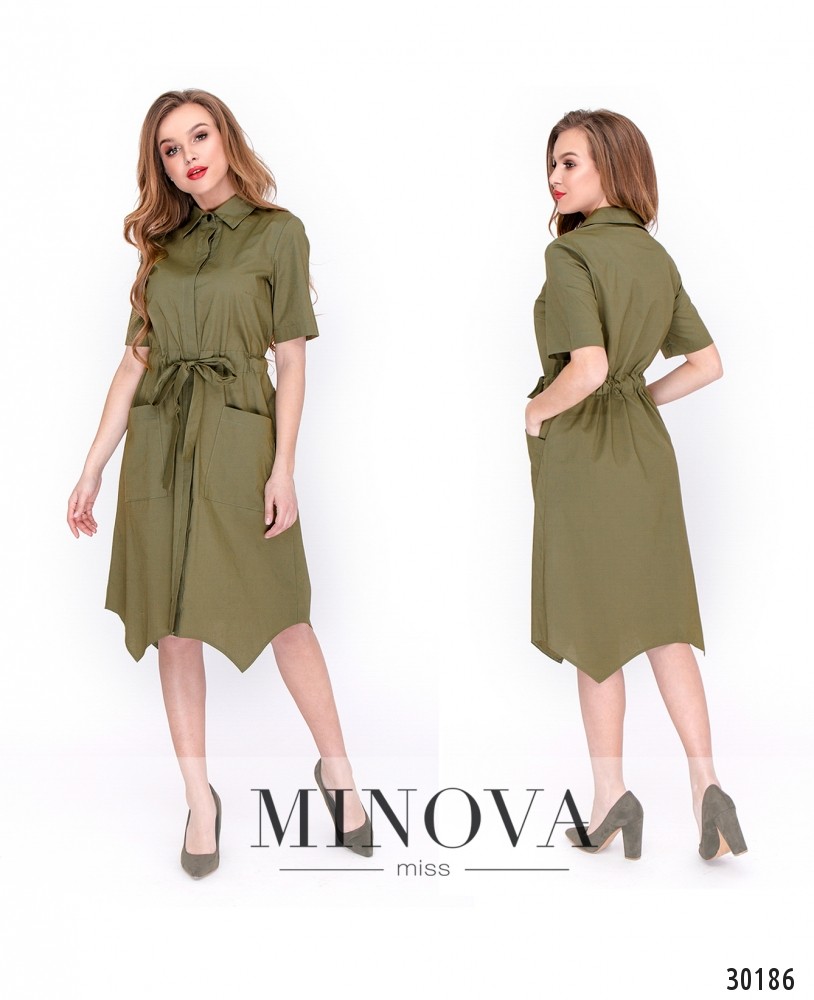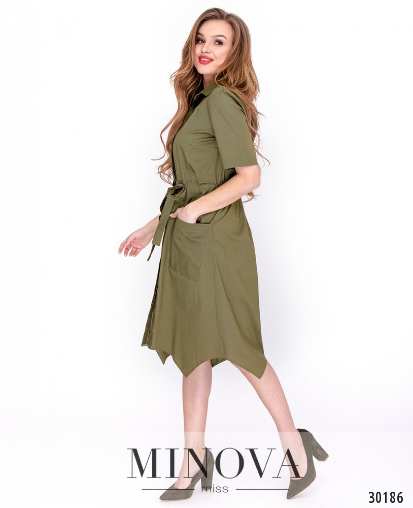 Платье-рубашка в стиле «сафари» с асимметричным подолом. Платье полностью застегивается на пуговицы на лицевой стороне. Талия регулируется вшитым поясом-кулиской и завязывается на лицевой стороне. Подол дополнен накладными карманами.