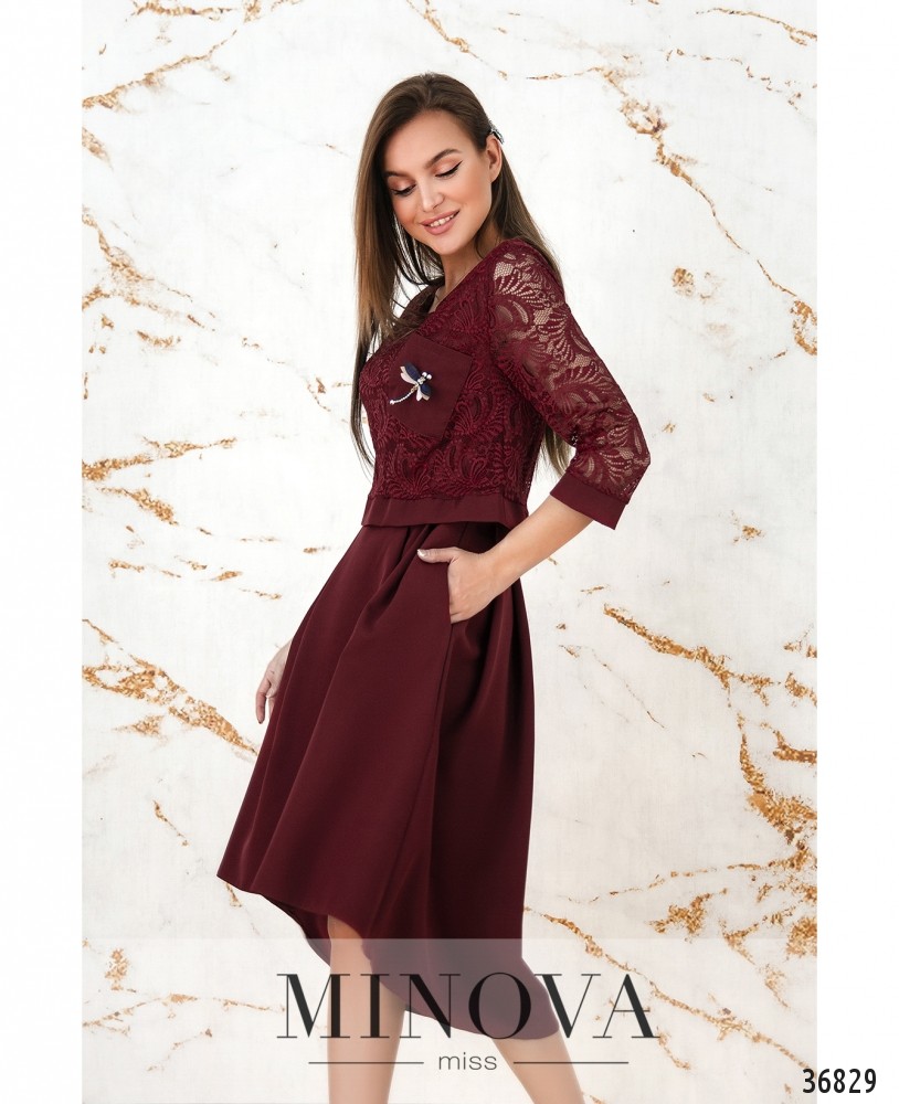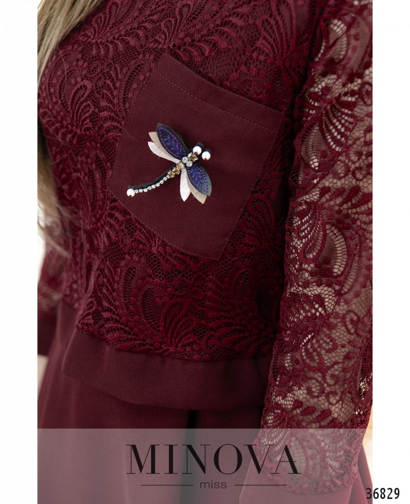 Нарядное платье с нежным кружевом из новой коллекции Minova станет прекрасным выбором для праздника или более официального торжественного мероприятия. Платье из мягкой ткани, сверху подшита кружевная накидка длиной до талии, укреплённая плотным манжетом снизу. Рукава длиной 3/4 также с небольшими манжетами, полностью кружевные, без подкладки. На груди и на нижней, и на верхней ткани – небольшие вытачки. Сверху справа располагается гладкий кармашек с брошью в виде стрекозы. На платье по бокам врезные карманы, застёжки на платье отсутствуют, вырез горловины полукруглый, широкий. Подол по спинке немного длиннее. Длина платья миди, поэтому стоит выбирать обувь на танкетке или каблуке любой высоты. Украшение входит в комплект.