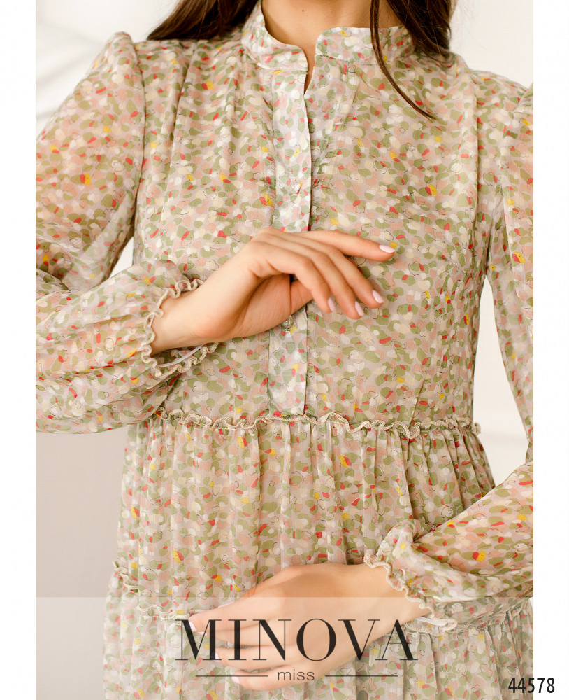 Нежное воздушное платье с мягкой подкладкой и верхним полупрозрачным слоем с несколькими рядами оборок. Рукава свободные, без подкладки, на запястьях присобраны резинкой. Воротник-стоечка, от него - ряд элегантных пуговиц до груди. Карманов нет.