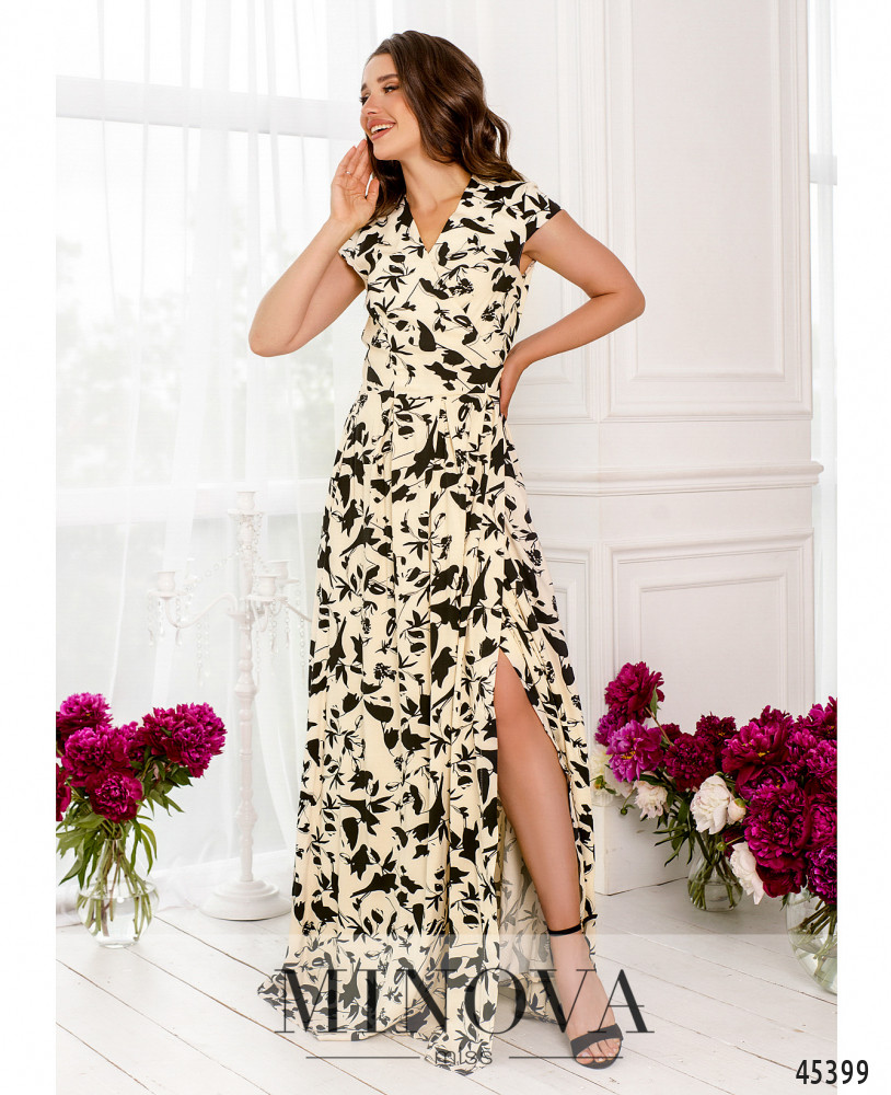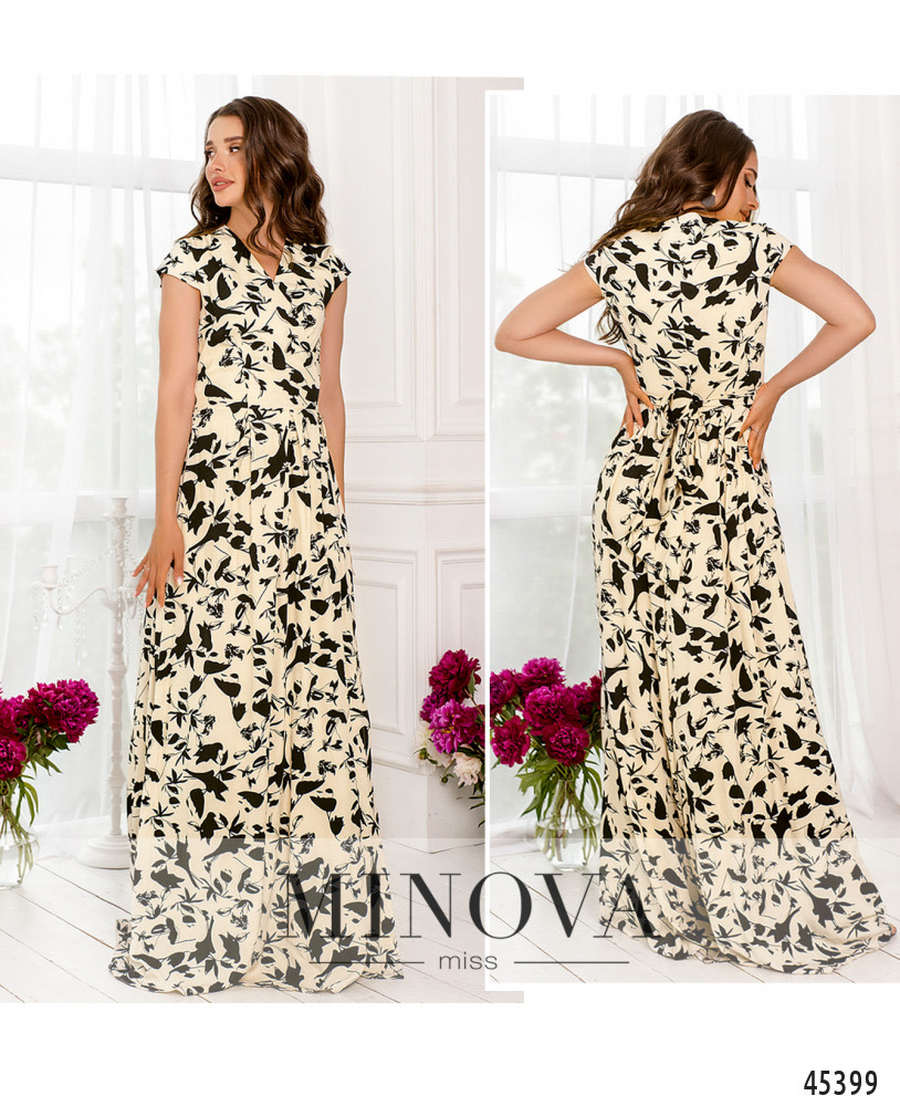 Женственное платье макси на запах с короткими рукавами-крылышками и V-образным вырезом подойдет к любому типу фигуры и сделает ваш силуэт еще более утонченным. Все это благодаря вытачкам спереди и сзади на лифе, а также большим складкам на подоле, делающим его воздушным и легким. В этой модели нет застежек, она фиксируется с помощью вшитого в нее текстильного пояса, который продевается через отверстие и завязывается на талии.