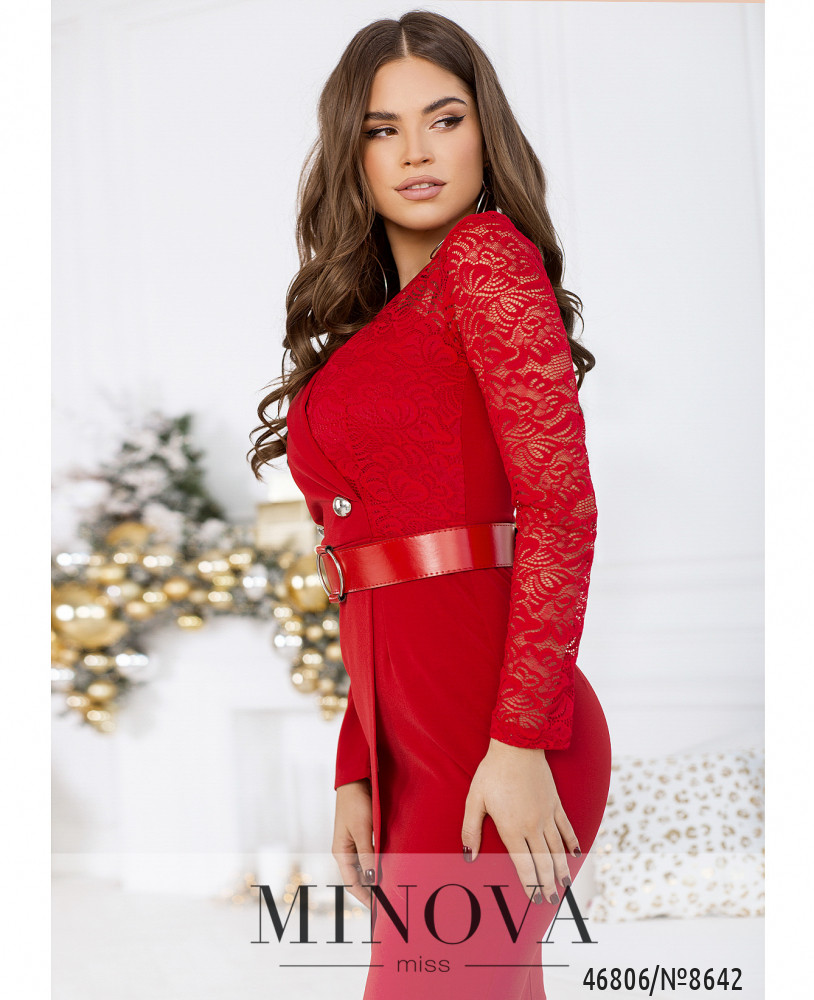 Благодаря этому изящному платью необычного кроя ваш новогодний образ получится стильным и шикарным. Верх модели выполнен из двух видов тканей: гладкой однотонной и полупрозрачной кружевной, а подол подшит на запах. Платье застегивается на змейку, вшитую по спинке.