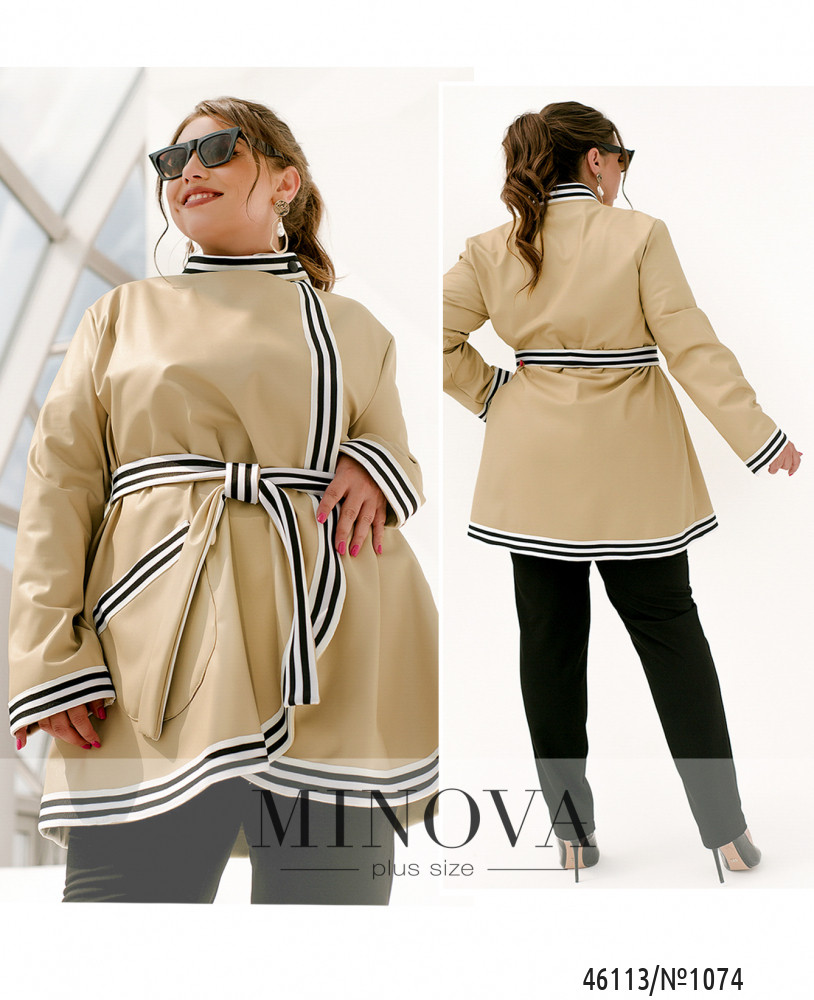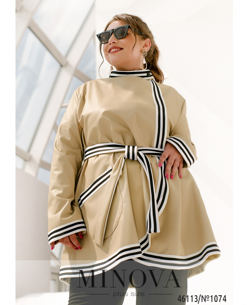 Легкая куртка без подкладки создает не только красоту, уверенность и комфорт, но и подчеркивает ваш индивидуальный стиль. Модель застегивается на одну кнопку на шее, а также крепится на талии с помощью текстильного пояса, который входит в комплект. Куртка дополнена одним накладным карманом и декоративной контрастной отделкой