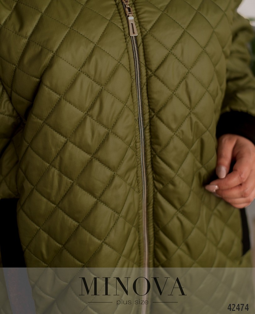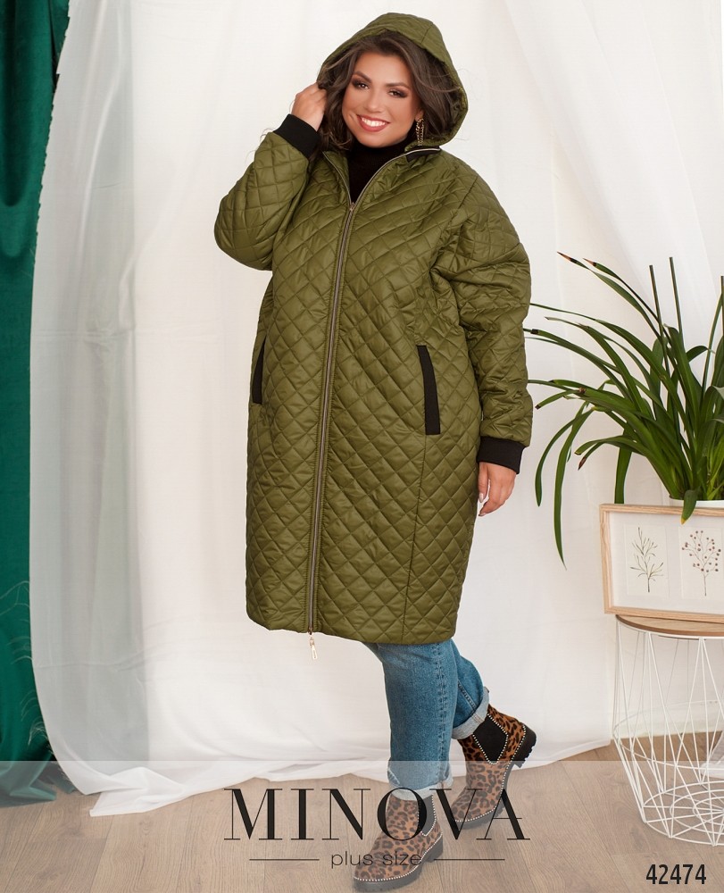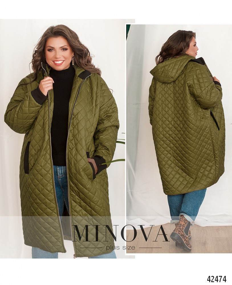 Длинная куртка большого размера с подкладкой. Воротник, рукава и врезные карманы мягкие. Ткань простёгана. Застёгивается на молнию, вшитую спереди, с двумя бегунками. В наличии капюшон.