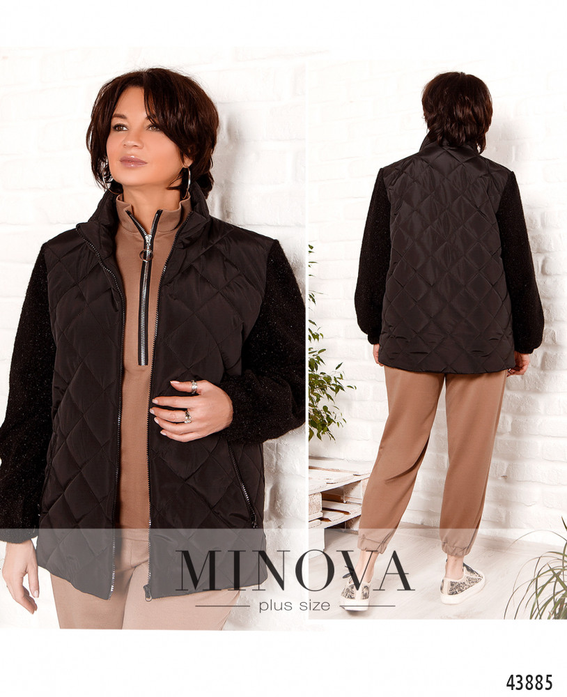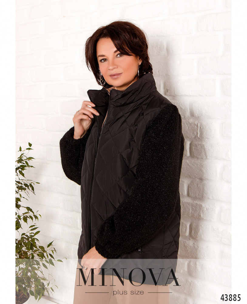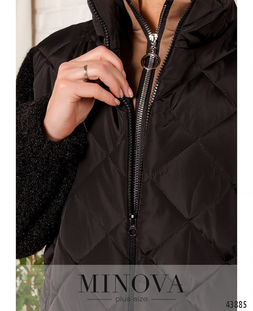 Мягкая и стильная куртка большого размера, основная часть - из простёганной ткани, рукава из нежного и теплого материала, с резинками в манжетах. Застёгивается на сквозную молнию по центру, от воротничка-стоечки. Основная часть с подкладкой. По бокам - прорезные карманы с молнией.
