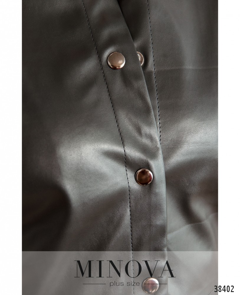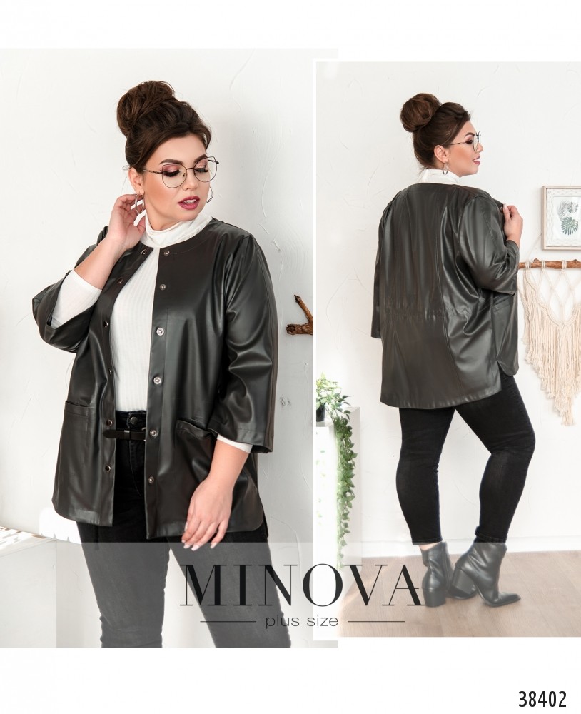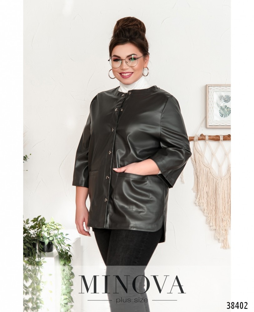 Стильная куртка большого размера с декоративными клапанами, застёгивается на ряд кнопок по центру, вырез горловины полукруглый, в пояс вшит шнурок, который завязывается изнутри. Рукава без манжет.
