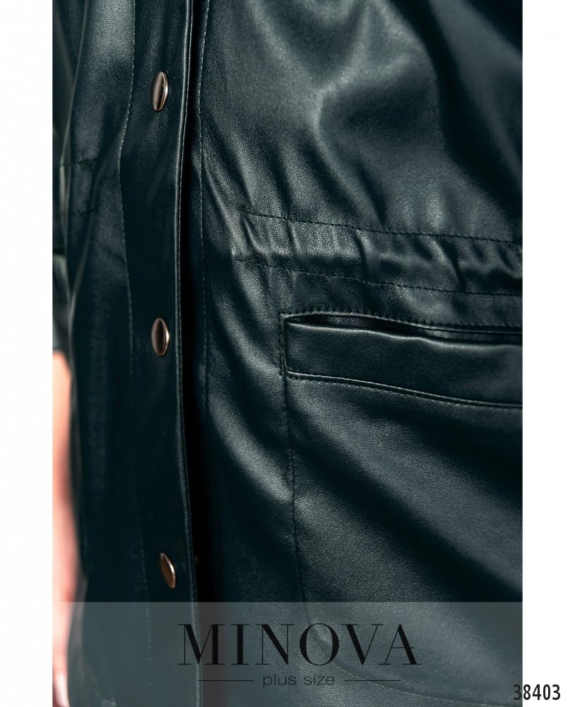Стильная куртка большого размера с декоративными клапанами, застёгивается на ряд кнопок по центру, вырез горловины полукруглый, в пояс вшит шнурок, который завязывается изнутри. Рукава без манжет.