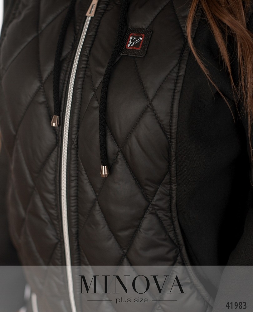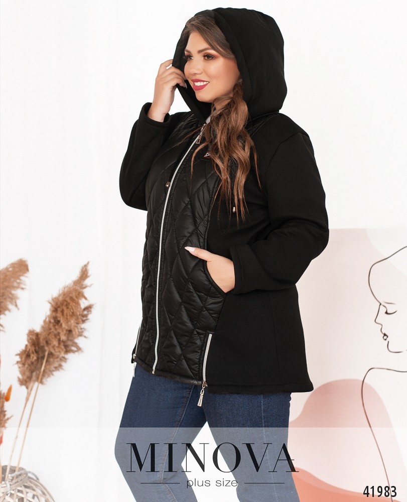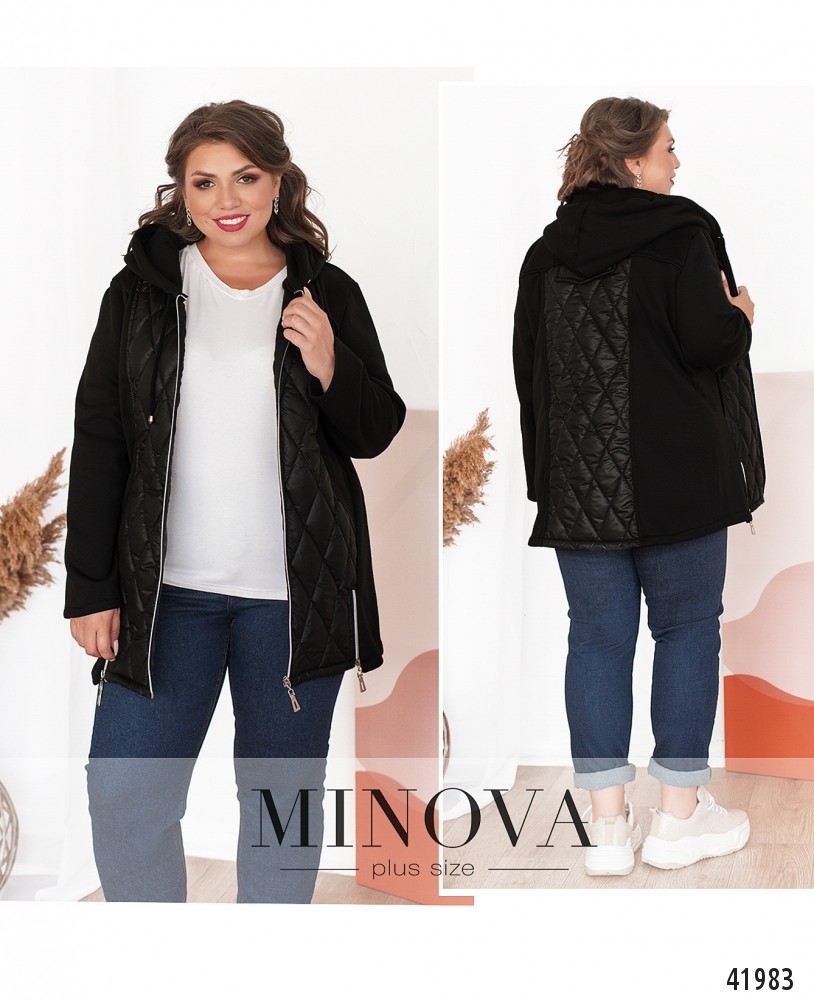 Привлекательная куртка батал с подкладкой на месте простёганных частей. Остальные части мягкие, без подкладки. В наличии капюшон с пропущенным через него шнурком. Рукава без манжет. Застёгивается на молнию по центру. Снизу спереди на подоле две молнии. На груди - декоративная нашивка. На спинке - декоративный клапан по центру. По бокам - врезные карманы.