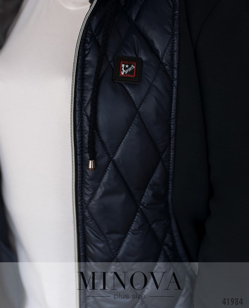 Привлекательная куртка батал с подкладкой на месте простёганных частей. Остальные части мягкие, без подкладки. В наличии капюшон с пропущенным через него шнурком. Рукава без манжет. Застёгивается на молнию по центру. Снизу спереди на подоле две молнии. На груди - декоративная нашивка. На спинке - декоративный клапан по центру. По бокам - врезные карманы.